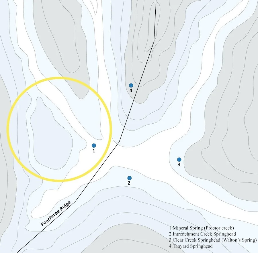 Atlanta is located on the southern slope of the Appalachian, Piedmont. The Peachtree Ridge is significant from the topographical perspective as it resulted from the folding of substrata. The site was selected near the Mineral Spring, a flattened area (encircled in the image above). This spring is the start of Proctor Creek, which connects to the Chattahoochee River. The history of different springheads suggests a direct relation to the active creeks of the 1700s. This suggests that the indigenous tribes resided near a watershed; it may have been a major source of travel and transportation.